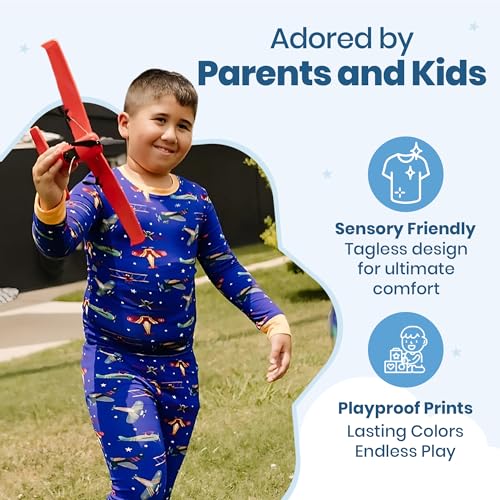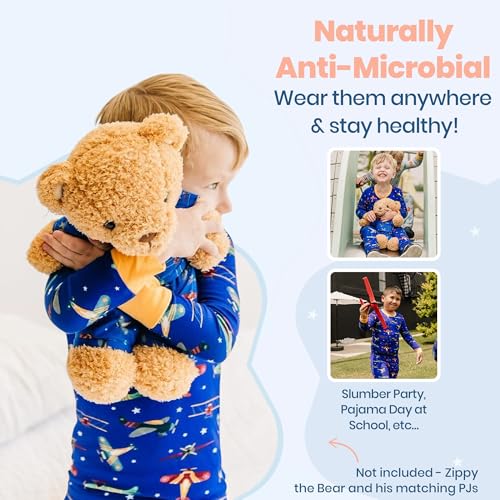 Fabric type: 95 % Viscose Derived From Bamboo, 5% SpandexOrigin: ImportedLuxuriously Soft Fabric: Our toddler pajamas are made from premium viscose, ensuring your child's comfort with buttery softness and breathability. This kids pajamas is perfect for your kid’s sensitive skin and providing ultimate coziness.Take flight into the dreamy skies with our Sky Sleepers pattern. Adorned with playful airplanes and twinkling stars, this set fuels the imagination of little aviators, setting the scene for nightly adventures across the clouds.Easy Care for Busy Parents: Designed for convenience, these pajamas for kids are machine washable, retaining their softness and vibrant colors wash after wash. Spend less time on laundry and more time with your child with our toddler girl pajamas.Perfect Gift for Little Boys: Our Sky Sleepers Pajamas are Ideal for birthdays, holidays, or special occasions, these pajamas come beautifully packaged and ready to gift. They are sure to be a hit with both kids and parentsPromotes Healthy Sleep Habits: Our Pajamas For Boys are not only stylish but also designed to encourage a good night's sleep. The breathable fabric helps regulate body temperature, ensuring your child stays comfortable all night long. Perfect for everyday use. supreme materials and excellent craftsmanship ensure long-lasting durability.