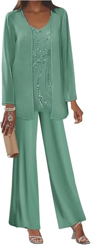 sought-after ! 3 Pieces Chiffon Mother of The Bride Pant Suits for Wedding Sequin Wedding Guest Outfit for Women with Jacket