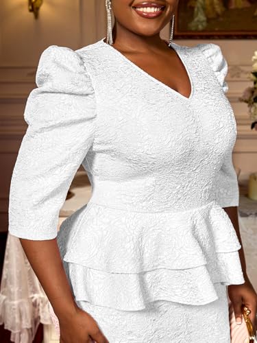 AOMEI Women's V Neck Peplum Jacquard Midi Dress Wear to Work 3/4 Puff Sleeve Sheath Dresses for Women 2025 Office