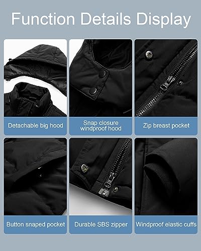 • 💕Function Details: This is a great design for cold weather with snap over zippered front closure.1 zipped breast pocket,2 button snaped deep pockets on each side.Chin guard prevents chafe.Double snap under the chin that protects even more.Adjustable drawstring snug hood can cinch up tight in cold wind and neck from inclimate weather.firm &smooth SBS zipper closure.Elastic ribbed cuffs to keep the cold air out.Easy to get in and out of due to the smooth interior