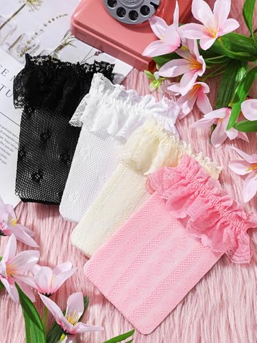 Geyoga 4 Pairs Women's Lace Socks Fishnet Mesh Knee High Stockings Lace Ankle High Socks for Women 7