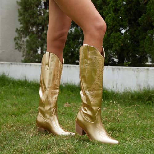 RKQ Women's Metallic Cowboy Boots Sparkle Knee High Cowgirl Boots Embroidered Western Wide Calf Boots with Pull on Tabs Pointed Toe Stacked Chunky Heel for Party Wedding Casual 5