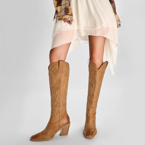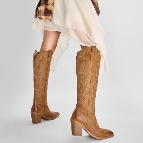 GOSERCE Cowboy Boots for Women - Western Cowgirl Boots Knee High Country Boots Pointed Toe with Embroidery Chunky Stacked Heel