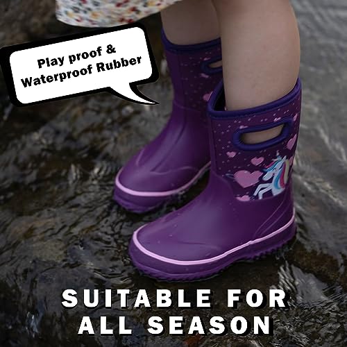 Sole material: RubberOuter material: NeopreneClosure type: Pull-OnWater resistance level: WaterproofPLAY FREELY: Our kids rain boots are made of durable rubber material and soft waterproof inner. Whether it's a rainy day, a field area, or a wet surface, these rubber boots allow boys and girls to play freely without worrying about getting their boots soakedEASY ON HANDLE: The hole as handles of the boots offer kids convenience to put on in a breeze. Your little kids will be proud of wearing these neoprene boots by themselvesNON-SLIP: These child muck boots are strong and slip-resistant, ensuring kids maintain stability and safety on slippery surfaces. Whether by the lake or on an outdoor adventure, these boots provide good traction that allows kids to play confidently without slippingCUTE PATTERN: The collar of these toddler rubber boots is made of fabric material that tightly wraps around the child's legs, improving protection. We add a pattern that personalized design makes the boots look more contemporary and interestingOUTDOOR CHOICE: Our neoprene boots come in multiple sizes, making them suitable for children of different ages. Whether you're shopping for a toddler or an older child, these mud boots will fit perfectly, providing the protection and comfort they need for outdoor play Perfect for everyday use. finest materials and excellent craftsmanship ensure long-lasting durability.