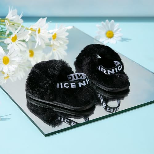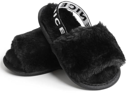 QIETION Girl's Soft Plush Lightweight House Slippers Non Slip Cross Band Slip on Open Toe Cozy Indoor Outdoor Slippers X102 Black 12CM 5