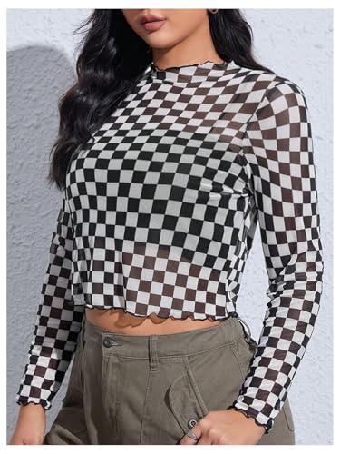 More information about WDIRARA Women's Plus Size Checkered T Shirt Sheer Mesh Tee Long Sleeve Crop Tops