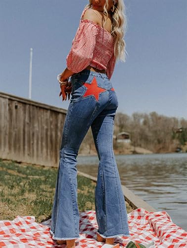 Mxiqqpltky Star Patchwork Bell Bottom Jeans for Women Mid Waist Bootcut Flare Jeans Stretch Straight Leg Skinny Denim Pants 7