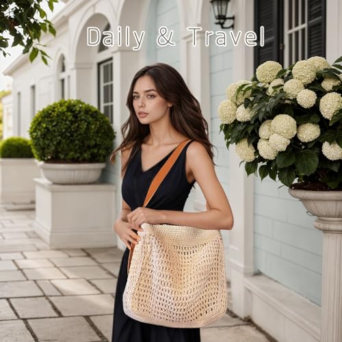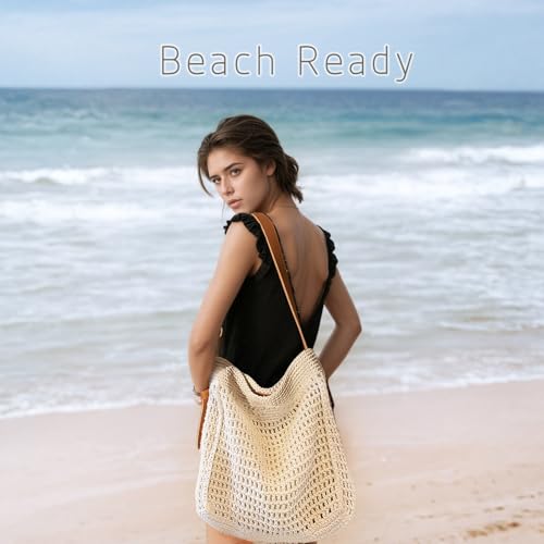 Crochet Beach Tote Bag for Women, Cute Soft Woven Summer Boho Purse Hangbags Shoulder Bags for Vacation 2025 Beige 7