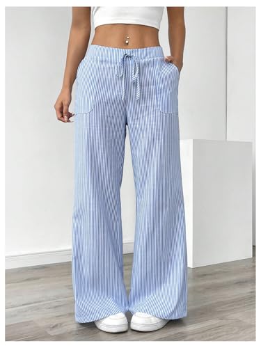 sought-after ! Women's Wide Leg Striped Pants Drawstring Low Waisted Casual Loose Trousers with Pocket