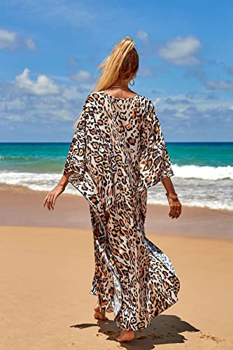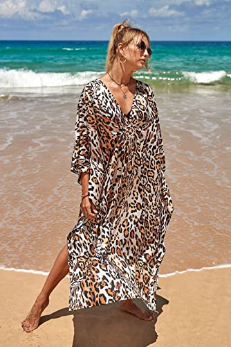 Fabric type: 100% PolyesterCare instructions: Machine WashOrigin: ImportedFlattering and Comfortable Fit: One Size Only, Designed to fit US sizes S,M,L,XL,XXL (4-22), this caftan offers a relaxed, flattering fit with a length of 53/135cm, shoulder width of 35/88cm, and chest circumference of 60/158cm. Perfect for women 5'3/(160 cm) or taller.Versatile and chic Design: This women’s plus-size kaftan dress features a vibrant bohemian leopard print. With a V-neck and oversized, loose-fitting design, it’s perfect for beach outings, poolside relaxation, casual summer evenings or a resort vacation. This loose fit also makes it ideal as a house dress, offering comfort and style all day long.High-Quality, Lightweight Fabric: Made from soft, breathable polyester, this cover-up is wrinkle-free, quick-drying, and perfect for hot summer days. The colorful leopard print provides excellent coverage while keeping you cool and comfortable. It’s the ideal choice for a plus size swim cover up for women.Perfect for Any Occasion: Whether lounging by the pool, heading to the beach, attending a summer party, or as resort wear, this kaftan dress fits every occasion. It also doubles as a loungewear piece or a maxi nightdress, providing comfort and style for a relaxed evening at home.Easy Care and Maintenance: This kaftan cover-up is machine washable, though we recommend hand washing in mild water to preserve its vibrant print. It’s designed for easy care, making it an essential and practical addition to your wardrobe. Perfect for everyday use. supreme materials and excellent craftsmanship ensure long-lasting durability.