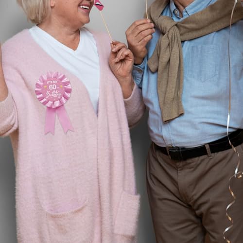 It's My 60th Birthday Tinplate Badge Pin Pink Satin Fabric 60 Year Old Birthday Themed Button Pin Party Decorations Award Ribbon Badge Pin