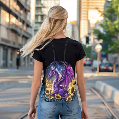 Erosebridal Dragon Drawstring Backpack 13x15.7, 3D Sunflower Safari Printed Drawstring Bags For Sport Gym, Galaxy Wildlife Foldable Draw String Back Bag, Yellow Purple Stars Animals String Backpack 4