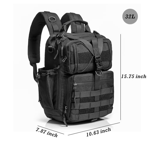 Origin: ImportedOuter material: PolyesterInner material: PolyesterClosure type: ZipperMilitary Tactical backpack size approx.:10.63'' x 7.87'' x 15.75β,Capacity: 32L; Military backpack is made of high density fabric 1200D polyester--durable and water-resistant.Tactical backpack: The back of the tactical bag and adjustable shoulder straps are ventilated mesh-padded, breathable, and pleasant. Tactical backpack for men with double-stitched, heavy-duty zippers and utility-style cord pulls, Side and front load compression system to adjust and tighten the backpack.Survival backpack: Y-strap and buckle on the front of the survival bug-out backpack for sleeping mats or sweatshirts. If you're looking for a dependable survival backpack, fishing backpack, or tactical backpack that can handle outdoor hiking, camping, survival, fishing trips, on foot, horseback, heavy-duty action, or otherwise, this is it. 10/10 would recommend for hikers, anglers, campers, and backpackers who like to get off the beaten path.The build quality is excellent. It's rugged enough to handle brush, bumps, and bouncing without any wear or tear. The water-resistant fabric kept your gear dry when you crossed shallow streams and when it drizzled unexpectedly. Once you reached the location, everything you needed was well-organized and easy to access. The compartments are thoughtfully laid out, and the MOLLE webbing adds even more versatility.Multiple compartments: Designed with 5 compartments for storing different items. The tactical assault pack backpack has 2 main compartments, 2 small compartments in front, and a back compartment for a hydration bladder. Suitable to become a 3-day assault pack, hunting backpack, army assault backpack, or day pack for daily use. Perfect for everyday use. supreme materials and excellent craftsmanship ensure long-lasting durability.