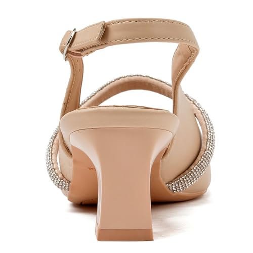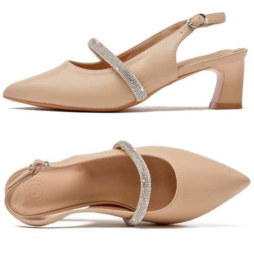Fabric type: Synthetic LeatherSole material: RubberOuter material: SyntheticClosure type: Buckle【Elegant Slingback Pumps】: The pointy toe and slingback design create the illusion of an accentuated leg line. These women's pumps are designed to exude elegance and elevate your look. Rhinestone-embellishedstrap at instep, Slingback with buckle can adjust the fitting freely, making it easy to put on and take off every day.【2.16-Inch Kitten Heel】: Heel height: 2.16 Platform height: 0.25. These pumps are set on a steady heel that strikes the perfect balance between comfort and height. Whether you're heading to the office, a party, or a special occasion, these kitten heels provide secure footing that is comfortable for walking.【A Must-Have Dress Shoes】: Shine bright on special occasions (silver, gold colors), the straps are adorned with glitter and rhinestones, making them the perfect statement pieces for parties, weddings, and celebrations. Simple style with Black Nude colors is easy to match with your a variety of clothes for party, date, club, wedding, business, or other occasions.【Comfy With All Day Wear】: Covered with smooth vegan leather the 4mm latex insole conforms to the shape of your foot and the soft cushioning cushions every step you take. enhances comfort by effectively cushioning and relieving pressure. Offers durability and stability so you can step out on any occasion with confidence.【Occasions & Outfits】: These slingback pumps are the epitome of versatility, Easily enhance your style whether for everyday/wedding/party and banquet. A versatile piece and a must have item in your shoe collection. Whether paired with office attire or a casual ensemble, they make a chic statement wherever you tread. Perfect for everyday use. supreme materials and excellent craftsmanship ensure long-lasting durability.