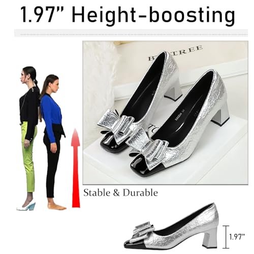 Women's Bow Printed Leather Chunky Heels Pumps Fashion Comfortable Closed Square Toe Slip On Mid Heel Dress Shoes for Party Date Office Wedding 5