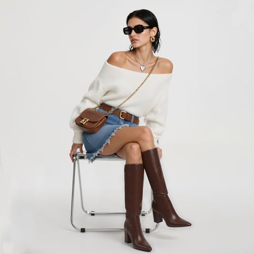 Pointed Toe Knee High Boots for Women Brown Chunky Heel Tall Boots Women Side Zipper Fall Boot Size 9.5 4