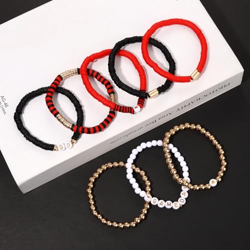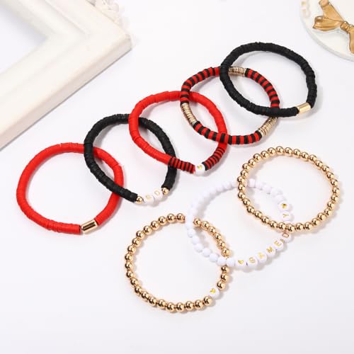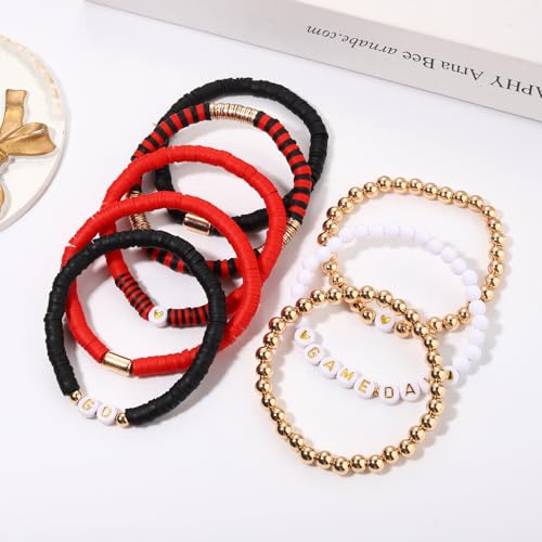 • Game Day Bracelets:It's Game Day!Score a touch down at your next tailgate with the Game Day Beaded Bracelet Set for Women!features football team colored disc clay beads,message 'GAME DAY' and 'GO' letters and gold and white round beads strung on elastic bands.they're are the remarkable game day accessory for any game day outfit.Make a statement and celebrate your team's kick off in style with these beaded football team colored GAME DAY letter bracelets.