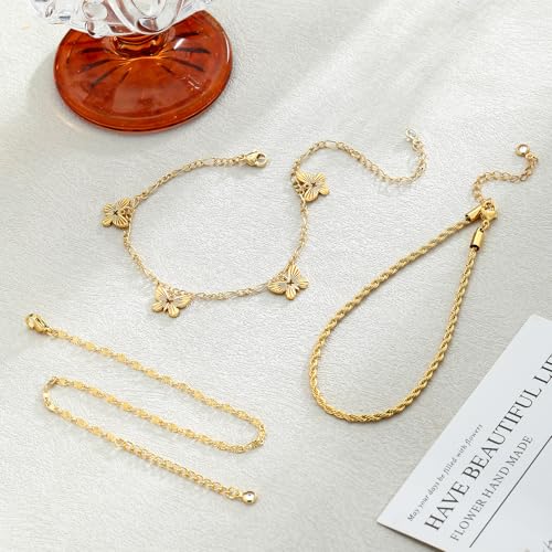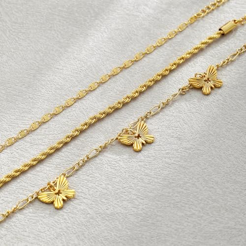 • 3Pcs Gold Anklets Set:Set includes:Mariner Anklet、Rope Anklet、Figaro with butterfly pendant Anklet; These ankle bracelets are suitable for being worn stacked as well as individually