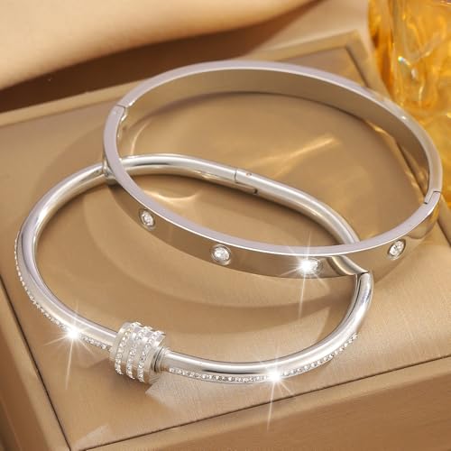 Material: Stainless Steel, CrystalMetal type: Stainless SteelClasp type: Fold OverChain type: Curb ChainGem type: Rhinestone【 Size - Love Bracelet Set 】Inner Circumference: 18CM (7 inches) Diameter:2.36“ x 1.97,Suitable for your wrist size from 5.7inches to 6.7 inches. Moreover, these silver stainless steel bracelets stack for women strike the perfect balance, neither too heavy nor too light, making them an ideal everyday accessory to infuse a touch of style into your ensemble. you can enjoy silver love bangles for years with virtually no maintenance and no worry about sensitive skin.【 Minimalist Design 】 Silver love bangle bracelet set for women feature charming designs, each bracelet can be worn individually or together with other bracelets or watches to create a sense of layering. A set of miniature love silver bangle stack for women and silver love bangle can provide more choices for your varied clothing matching.【 Easy to use 】 The dainty silver love bracelet with hidden clasp is simple and elegant and very easy to get on and off for women. Insert your index finger and pull the top part and use your thumb to push the bottom part. Another screw bracelet requires rotating upwards like a screw to open and downwards like a screw to close, making the bracelet more secure and less likely to fall off.【 Gift for Her 】 Exquisite and stylish, these bangle bracelets for women are a perfect symbol of elegance. Each bracelet is meticulously crafted with fine details, presenting a unique charm. They come accompanied by a attractive gift box, all set and primed to be bestowed as tokens of affection. These delicate yet eye-catching bracelets serve as ideal presents for the special women in your life - be it girlfriends, wives, mothers, grandmothers, or aunts. Whether it's Valentine's Day, birthdays, weddings, engagements, anniversaries, Thanksgiving, Christmas, or Mother's Day, these bracelets are bound to add a touch of glamour and sentiment to every precious occasion.【 After Sale Service 】 About this silver bracelet stack , If you have any questions about love bangle set, please do not hesitate to contact us at any time and we will respond within 24 business hours. Perfect for everyday use. finest materials and excellent craftsmanship ensure long-lasting durability.