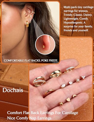 Dochais 14K Gold Plated Surgical Steel Earrings for Sensitive Ears 20G Flat Back Earrings Small Hoop for Women Trendy Dainty Cartilage Stacks Flatback Stud for Helix Multiple Piercing Jewelry