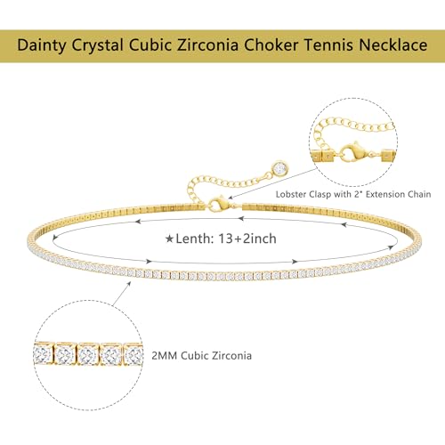 Item width: 3 inchesMaterial: BrassMetal type: BrassClasp type: LobsterChain type: TennisGem type: Cubic ZirconiaCubic Zirconia Design: This tennis necklace with high polished artificial diamond shining and glittering under the light. The enduring and elegant design fit for both formal and casual occasions, would not be easy to go out of styleHypoallergenic Material: Our 14K gold plated/sterling silver tennis necklace is made of cubic zirconia which is dainty and brilliant. And this tennis necklace chain is nickel free, lead free, and hypoallergenicTennis Necklace Size: Width: 2mm round cz stones, length:13 long + 2 adjustable extender. The rhinestone necklace for women is waterproof and non tarnish, our dainty choker necklace for women packaged with a delicate boxPerfect Present Idea: Trendy zirconia chokers for women is a perfect gift for your friend, mom, sisters, wife, girlfriend. And this womens rhinestone jewelry is for birthday, wedding, Mother's Day, Valentine's Day, and moreCustomer Service: If you are not satisfied with the 14k gold plated/sterling silver tennis necklaces for women, please connect to us directly and we will help you solve any problems Perfect for everyday use. supreme materials and excellent craftsmanship ensure long-lasting durability.