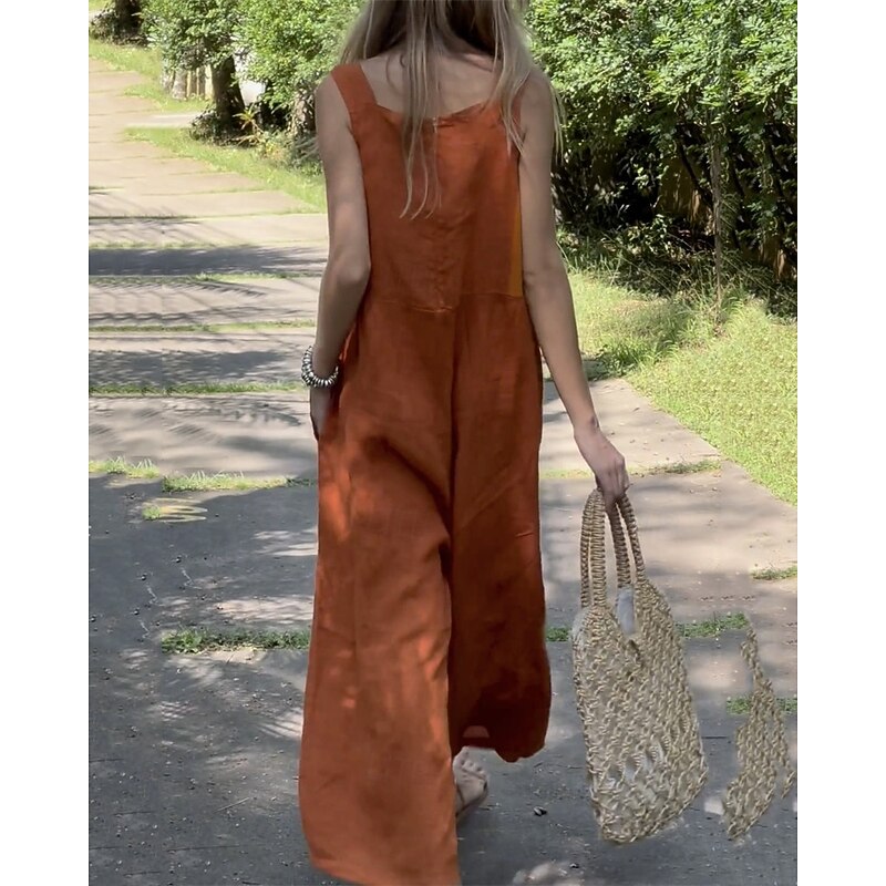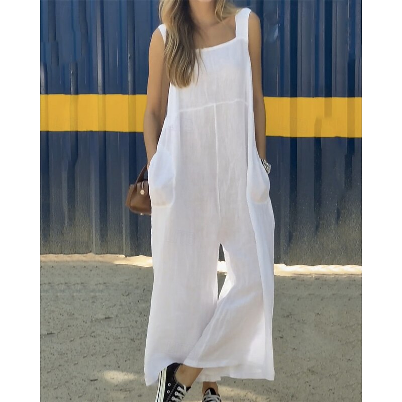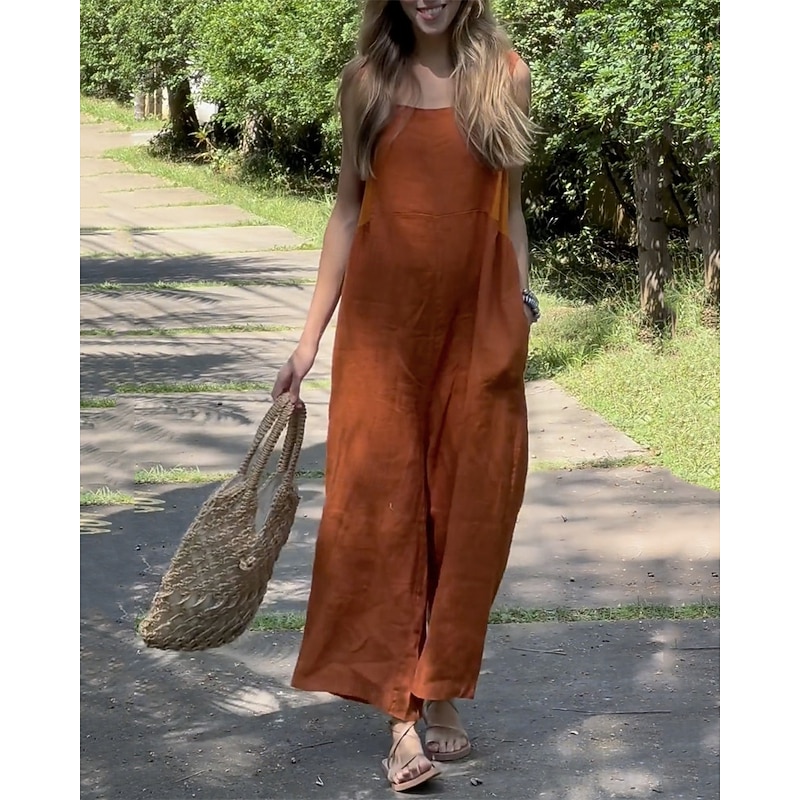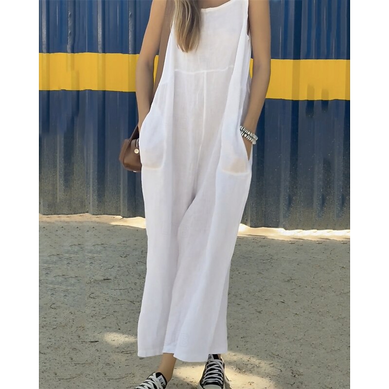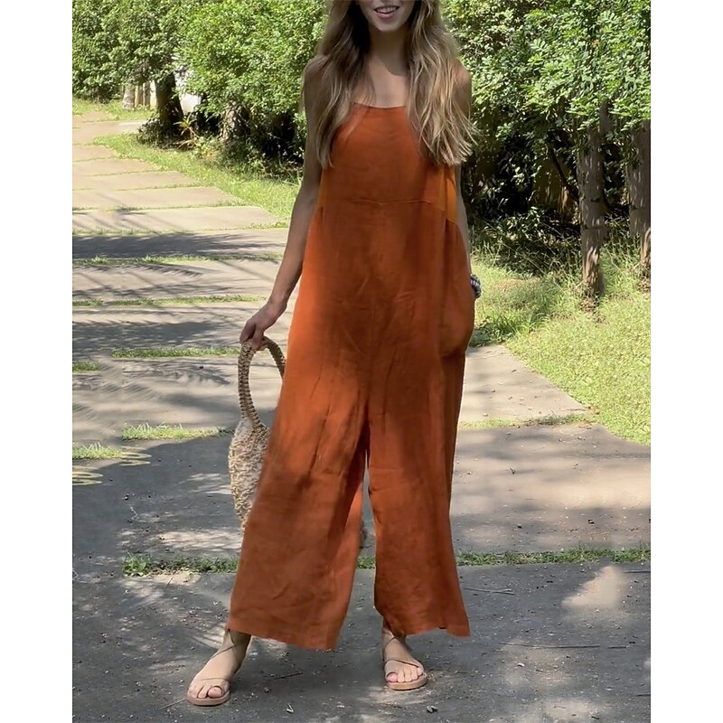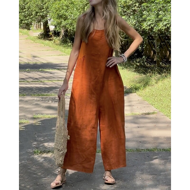sought-after ! Women's Normal Linen-Inspired Jumpsuits Pants Holiday Solid Color Sleeveless Wide Leg Pocket Street Daily Regular Fit White Orange Green Summer