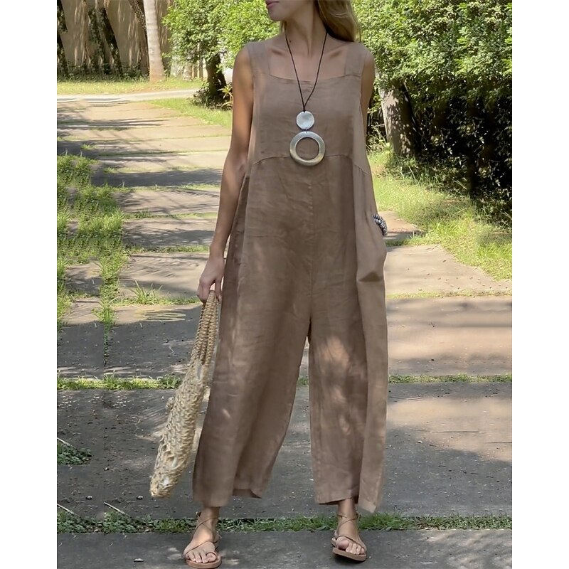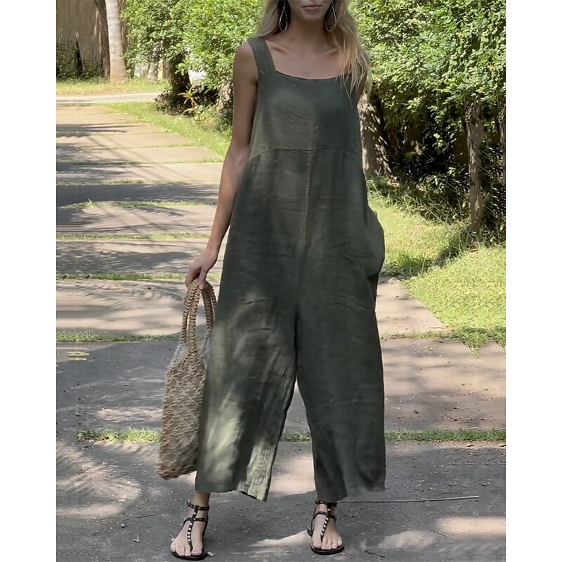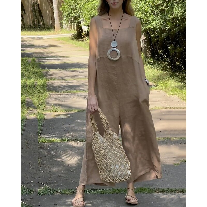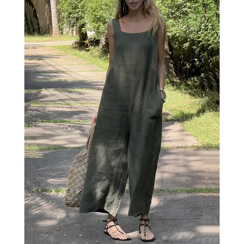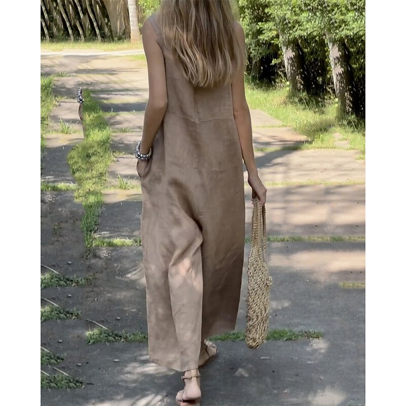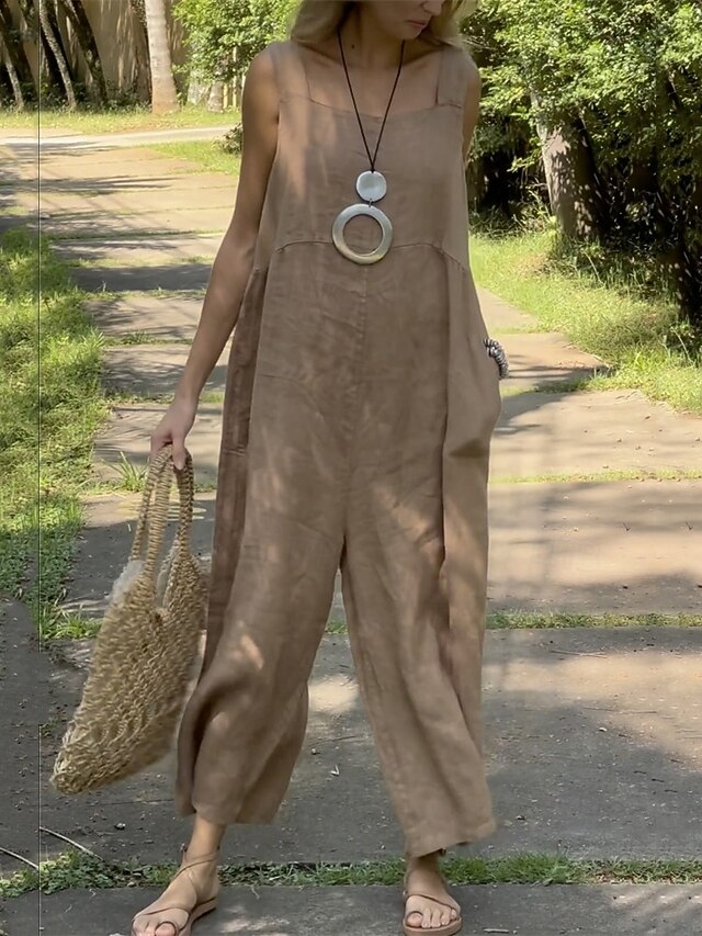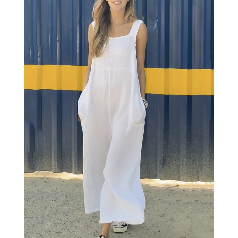 sought-after ! Women's Normal Linen-Inspired Jumpsuits Pants Holiday Solid Color Sleeveless Wide Leg Pocket Street Daily Regular Fit White Orange Green Summer