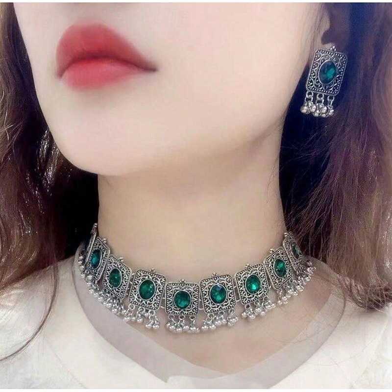 Highlights [Fabric and Materials:] This elegant jewelry set is crafted from rugged alloy, featuring intricate gold-tone metalwork and embellished with vibrant gemstones. The high-quality materials ensure lasting shine and elegance suitable for various occasions. [Design and Style:] The statement choker showcases ornate square embellishments, each hosting a striking gemstone that adds a rich contrast. Delicate gold beads gracefully dangle below, providing traditional charm and sophistication. The matching earrings mirror the choker’s design, with meticulous metalwork and bead detailing that complete this exquisite set. [Design Highlights:] Each piece in the jewelry set is meticulously crafted with attention to detail. The central green gemstones are surrounded by detailed metalwork and bead accents, reflecting a vintage-inspired flair that adds a regal touch to any attire. [Occasions:] This jewelry set is ideal for weddings, evening parties, gift-giving, or any formal event. It effortlessly enhances both formal and everyday styles, offering a touch of elegance and timeless grace suitable for numerous occasions. [Size and Fit:] The jewelry set is designed for women, with universal styling that complements various attires and occasions. It is suitable for those seeking a combination of elegance and sophistication without limiting specific size requirements.