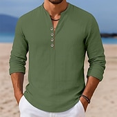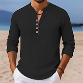 sought-after ! Men's Shirt Linen Shirt Summer Shirt Beach Shirt Solid Color Vacation Casual Black White Green Light Blue Long Sleeve Henley Fall Spring & Summer Clothing Apparel