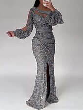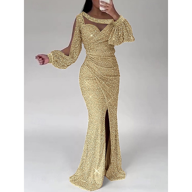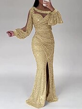 Why Choose Mermaid Sequin Evening Gown Party Dress Formal Sweep / Brush Train Long Sleeve Scoop Neck with Glitter Ruched Slit Masquerade Dress?