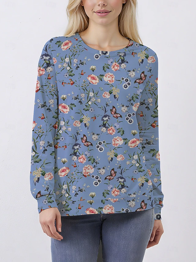 sought-after ! Women's Pullover Sweatshirt Hoodies Floral Graphic enduring Casual Print Long Sleeve Crew Neck Round Neck Regular Tops Casual Holiday Print Blue Fall Winter